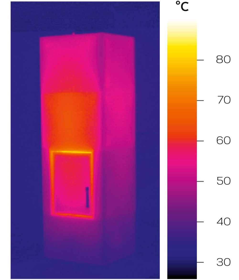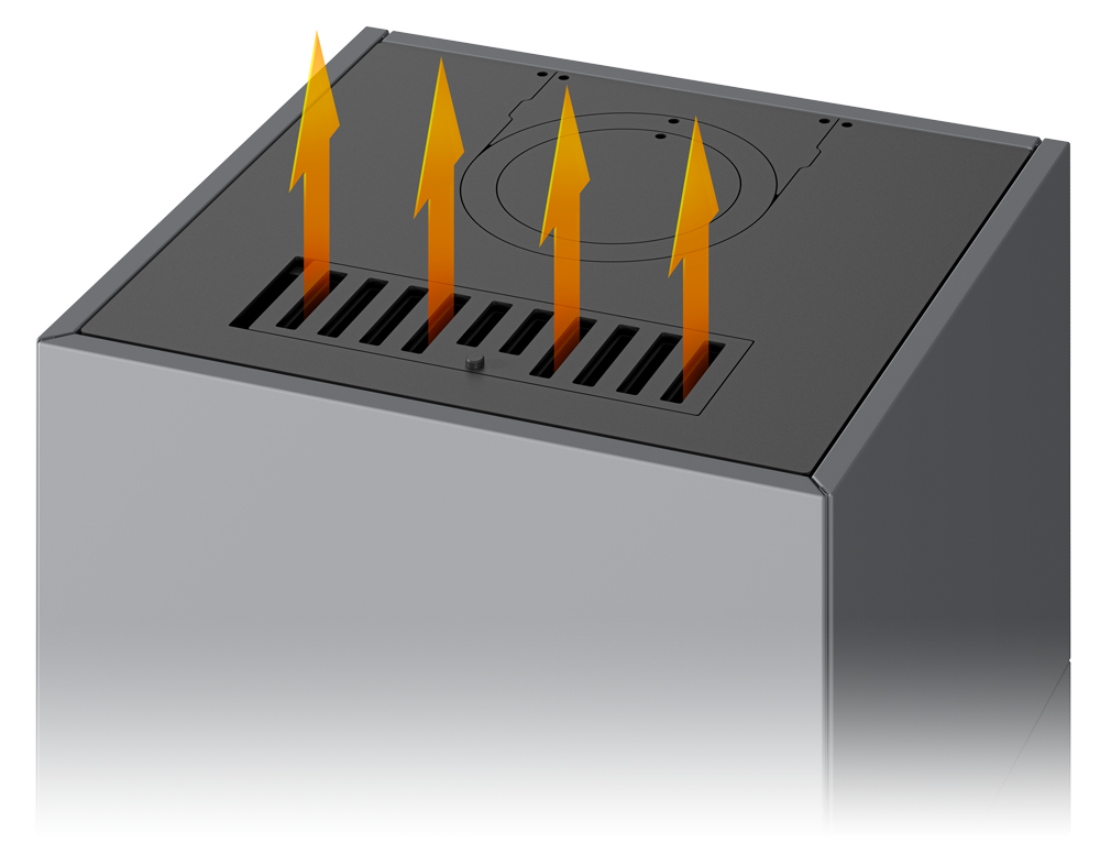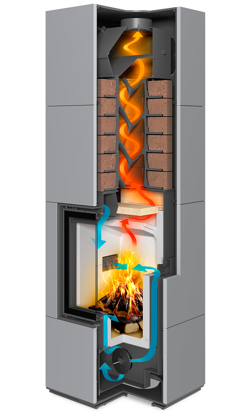 Этот принцип возможен благодаря сочетанию топки и запатентованных аккумуляционных колец MAMMOTH. В центре колец находится массивная чугунная спираль, быстро нагревающаяся и передающая тепло аккумуляционной массе магнетита. Благодаря высокой плотности, магнетит идеально насыщается энергией, а затем медленно отдает ее обратно в помещение. Самая аккумуляционная часть весит почти 230 кг, что представляет собой действительно массивный накопитель тепла. Однако комфорт наступает быстро – помещение сначала нагревается излучением через большую стеклянную дверцу, а затем добавляется тепло аккумуляционной массы и всей обшивки печи.
